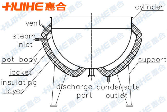 Vertical steam heating jacketed kettle(agitating) is also named vertical steam heating double-layer cauldron. Usually composed of pot and hold feet, and the pot is the double layer structure formed by inside and outside spherical pot; middle layer can add steam to steam. It has characteristics such as big heating area, high thermal efficiency, uniform heating, short boiling time, easy control of the heating temperature etc. Not only has good-appearance, but also easy to install and operate. It is safe and convenient. Now it has been widely applied in food processing. Some large restaurants and canteens also use it to boil soup, cook, stew and porridge. It is considered to be the ideal equipment in the area of improving quality, shortening the time and improving working conditions