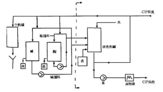 圖2所示的CIP清洗裝置的特點:水、堿、酸等各種清洗液分別放在各自的貯桶里,清洗完堿、酸等溶液后回收。當(dāng)清洗液濃度降低時補充酸、堿清洗液后再重復(fù)使用。