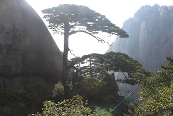 黃山迎客松,800多年的樹齡,樹干中部伸出長達(dá)7.6米的兩大側(cè)枝展向前方,恰似一位好客的主人,揮展雙臂,熱情地歡迎五湖四海的賓客到黃山游覽。