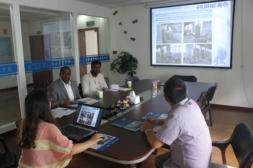 非洲吉布提客戶需要訂制全套牛奶生產(chǎn)線設(shè)備,來我公司參觀并與銷售人員進(jìn)行具體細(xì)節(jié)的洽談。
